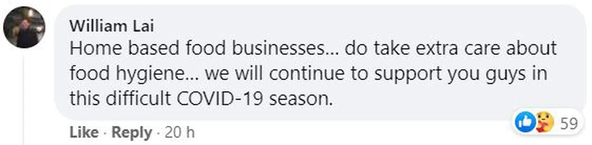 “尽管如此,居家餐饮生意仍须确保其销售的食品,是可安全食用的。我们也在网站上罗列出良好食品卫生的指导方针,业者必须时刻遵守。”