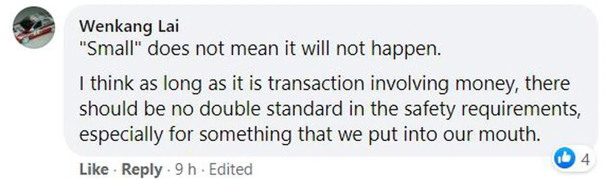 一些网民认为,销量少风险低不能担保食物中毒事件不会发生,只要涉及金钱交易,就不应持双重标准。