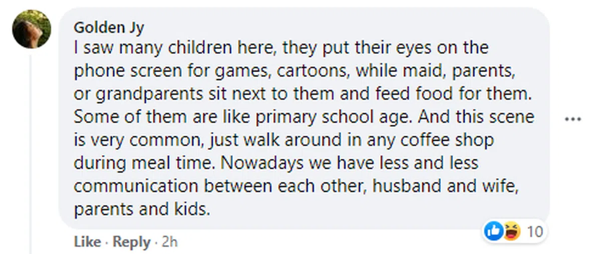 网民普遍表示,本地小孩和青少年,甚至是成年人,一般都是手机或ipad不离手,特别是吃饭的时候,简直就是游戏和卡通“拌饭”,导致与家人面对面聊天的社交时间,越变越少。