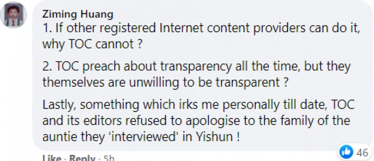 向资媒局注册的互联网内容供应商都会提供资金来源信息保持透明,TOC没有理由不遵守该规定;