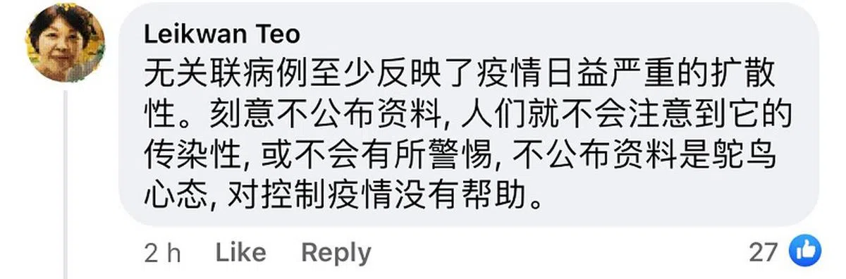 “我们还没走到那一步,无关联病例的数据对我们依然有意义,它让我们了解到本地疫情到底是失控了,还是稳定的。 在通报单日新增病例时,我们仍应细分为关联与无关联病例,以及哪些是已隔离的关联病例,哪些是未隔离的关联病例。 这可以让我们了解到接下来潜在新病例的来源途径,以及我们是否能及时追踪到密切接触者。”