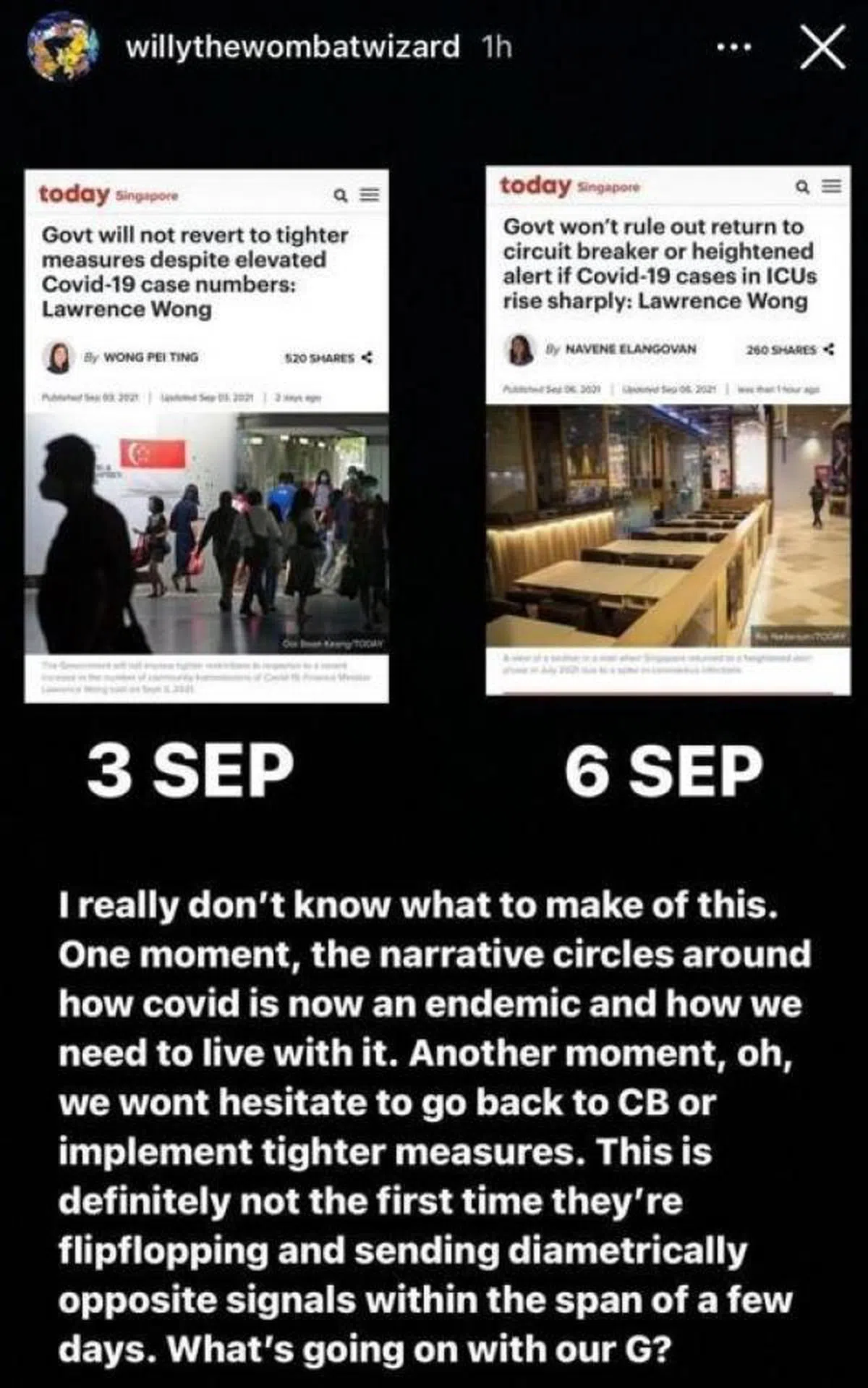 为何政府在9月3日宣布说,即使每日病例增加,我们也坚决不走回头路(不再实施病毒阻断或高警戒防疫措施)。 三天后(9月6日)又改口说,如果加护病房的病例急速增加,政府不排除再度实施病毒阻断措施(circuit breaker)或者高警戒防疫措施。搞到人民都有点弄不清楚何谓“与冠病共存”?