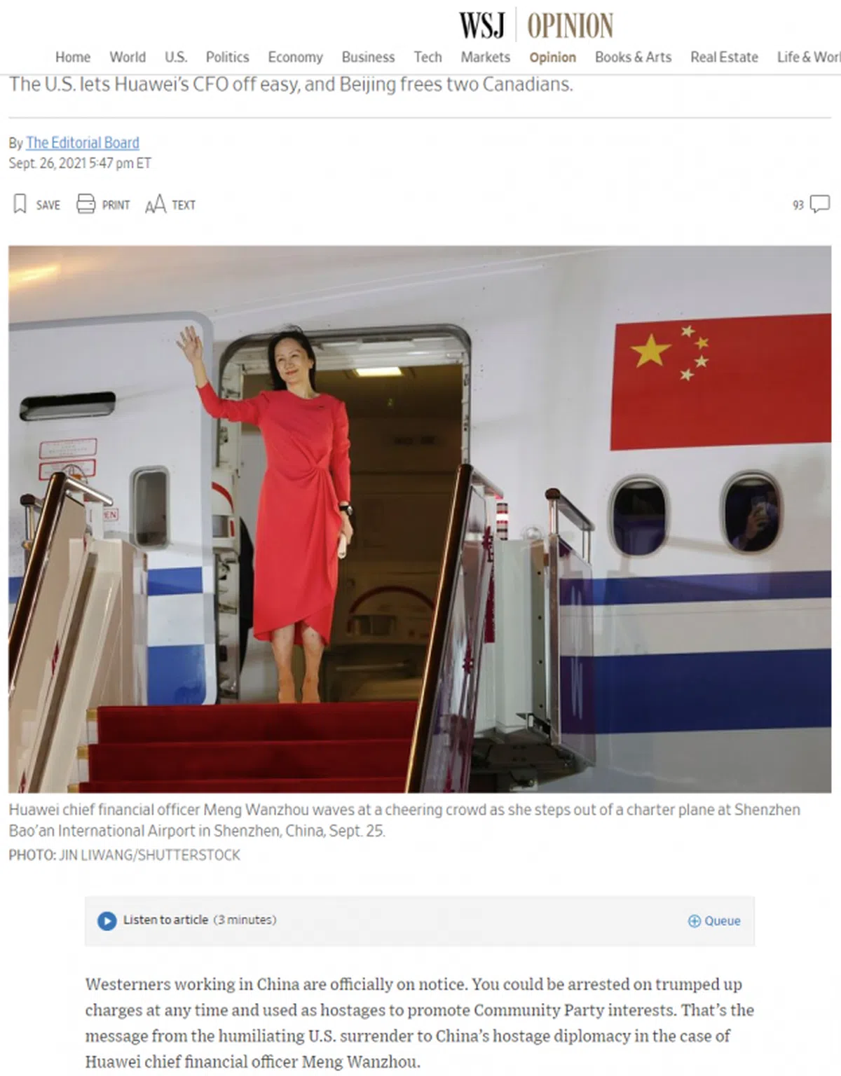 例如《华尔街日报》社论就以非常耸动的文字,重炮批评孟晚舟和两名加拿大人先后获释的关联性,恐向中国和外界释放出“人质外交”可行的信号。