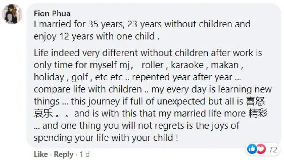 以下网民说,她结婚了35年,早前的23年没有诞下孩子,之后的12年选择与孩子相伴度过。