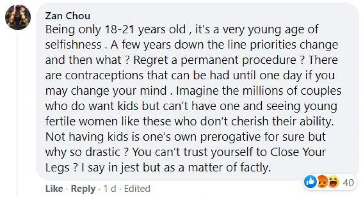 不赞同的一派则认为,这些受访男女的年纪尚小,想法行为可能比较以自我为中心。若干年后,也许他们的观念会转变,想要生孩子,届时若因永久结扎而不能如愿肯定会追悔莫及。