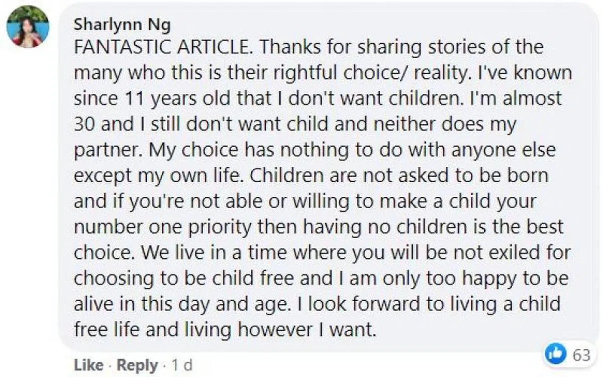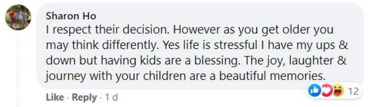 一些人表示尊重这些不生育男女的决定,但也提个醒,说年龄和阅历渐长后,人生态度可能会发生转变。网民分享道,生活很压力固然没错,但有了孩子后会有更多美好的回忆。