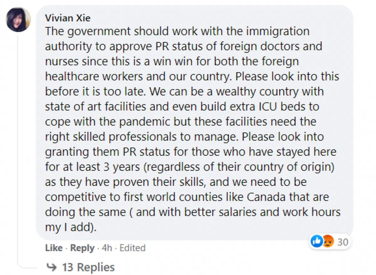 另一网友就说,就给他们永久居民权吧,我们真的很需要医护人员,对两者都是双赢的。
