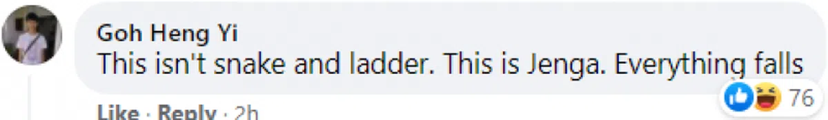 其中一个网民的留言得到相当多人点赞。他写道,也许这并不是蛇梯棋,而是Jenga叠叠乐积木游戏呢,抽错一块,所有积木全落下来散成一团?