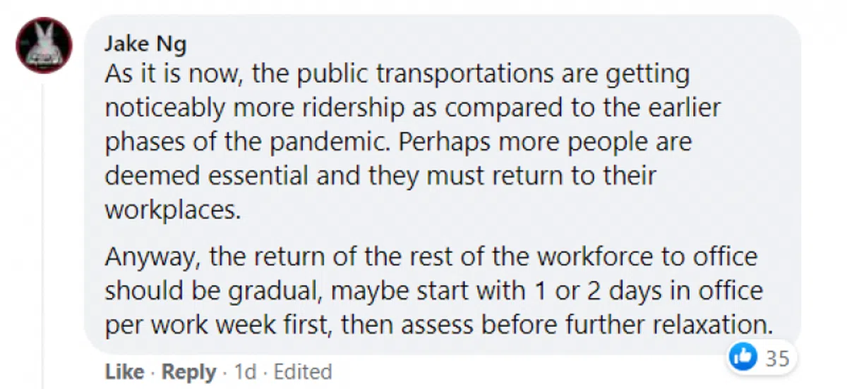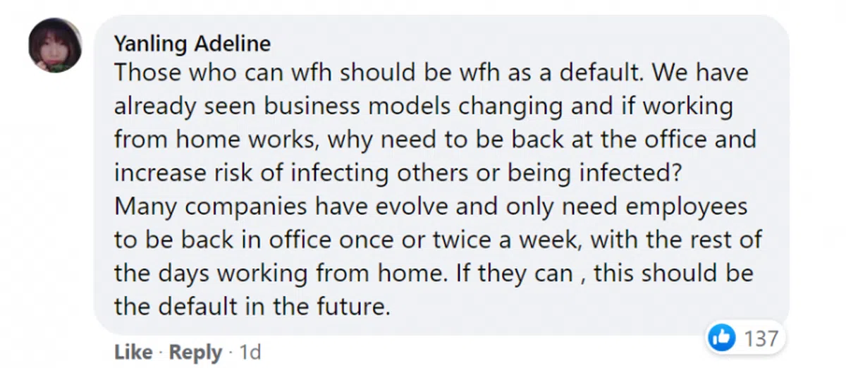 有网民认为,当局应该鼓励那些可以让员工在家办公的企业继续延续这个工作模式来减低病毒传播风险。这应该成为未来的既定模式,即:员工只有在必要时才回办公室,其余时间在家办公。