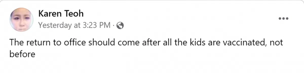 一位相信是已为人母的网民认为,应该让小孩子们都接种了,再重返办公室工作。否则,会把病毒带回家,提高年幼小孩感染冠病的风险。
