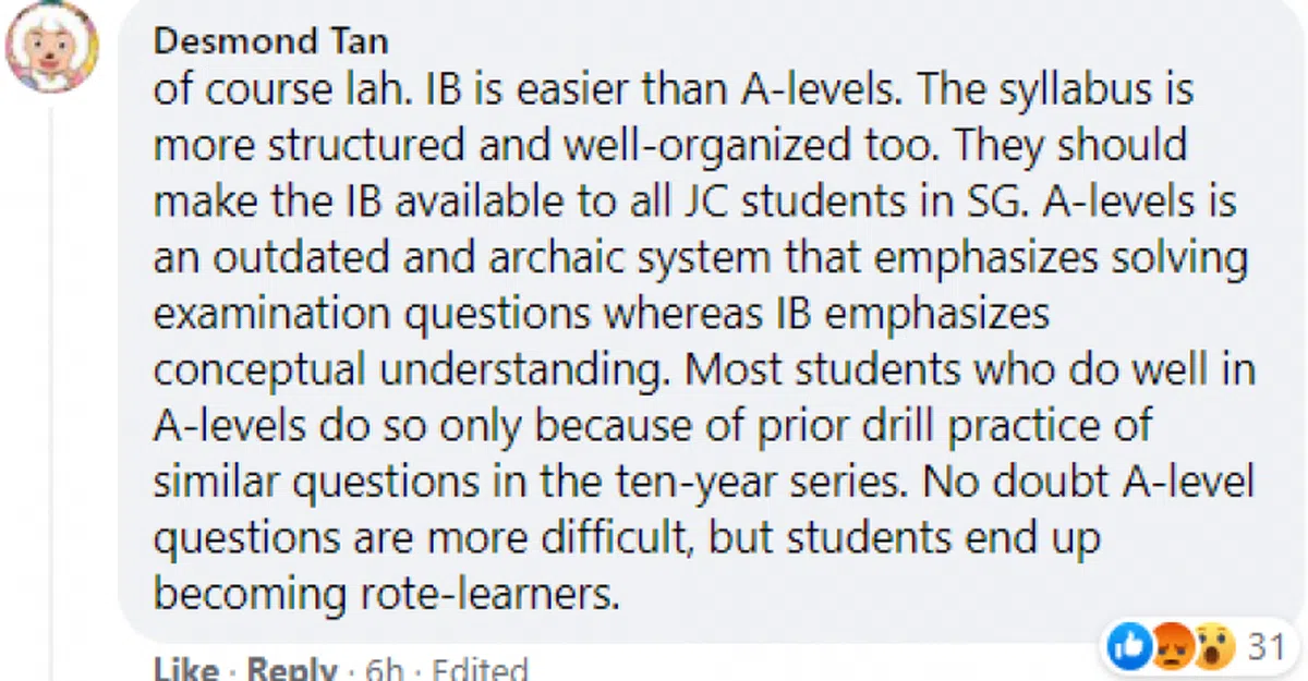 许多网民在为新加坡学生在2021年IB会考中的卓越表现喝彩的同时也指出,相比之下,IB考试比A水准会考来得更简单,因此新加坡学生在IB会考中成绩卓越,并不奇怪。