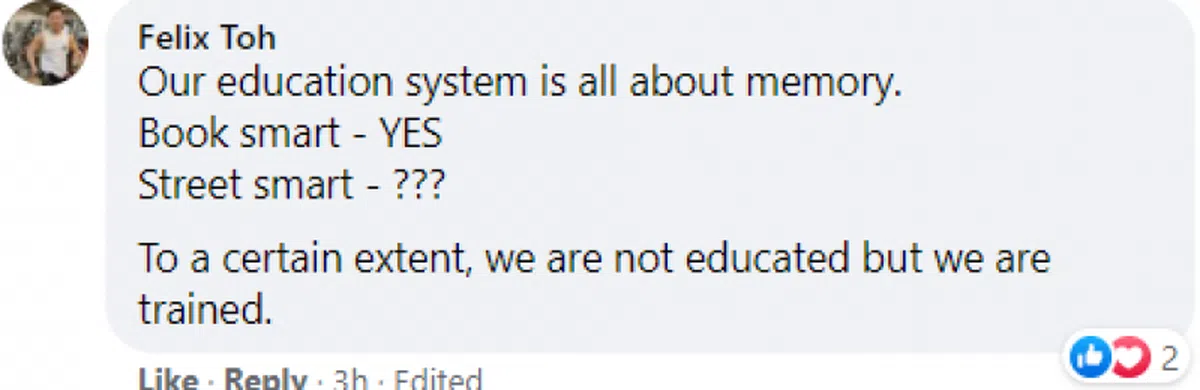 新加坡学生很会读书(Book Smart)却不见得善于变通(Street Smart)。某种程度而言,我们不能算是受过教育,只是受过培训罢了。