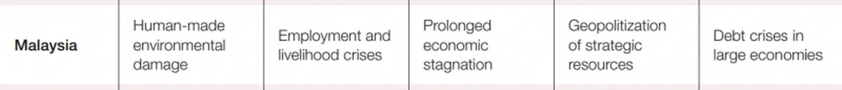 对邻国马来西亚的企业而言,人为环境破坏是头号风险。接着依次是:就业与生计危机、经济长期停滞、地缘政治资源争夺、大型经济体的债务危机。