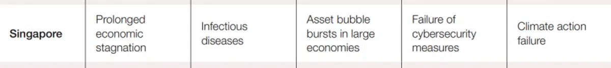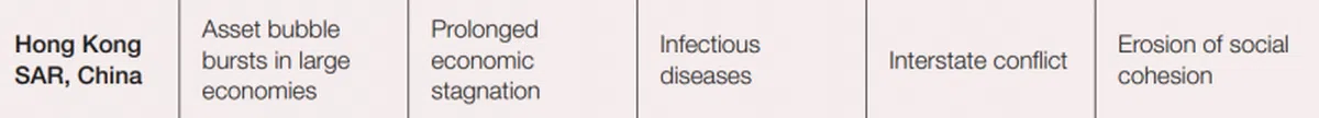 经常被用来与我国进行对比的香港,则将资产泡沫破裂、经济长期停滞、传染性疾病、国与国的冲突、社会凝聚力侵蚀列为前五大风险。