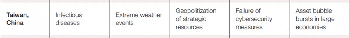 至于台湾,前五大风险分别是:传染性疾病、极端天气事件、地缘政治资源争夺、网络安全策略失效、资产泡沫破裂。