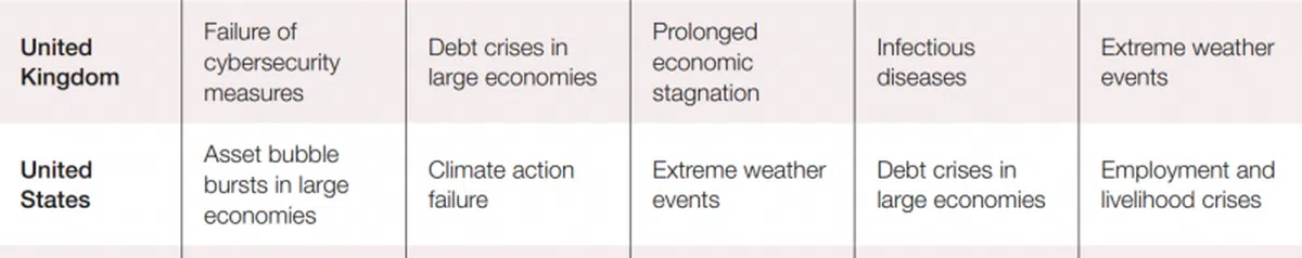 英国企业则依次是:网络安全策略失效、大型经济体的债务危机、经济长期停滞、传染性疾病、极端天气事件。