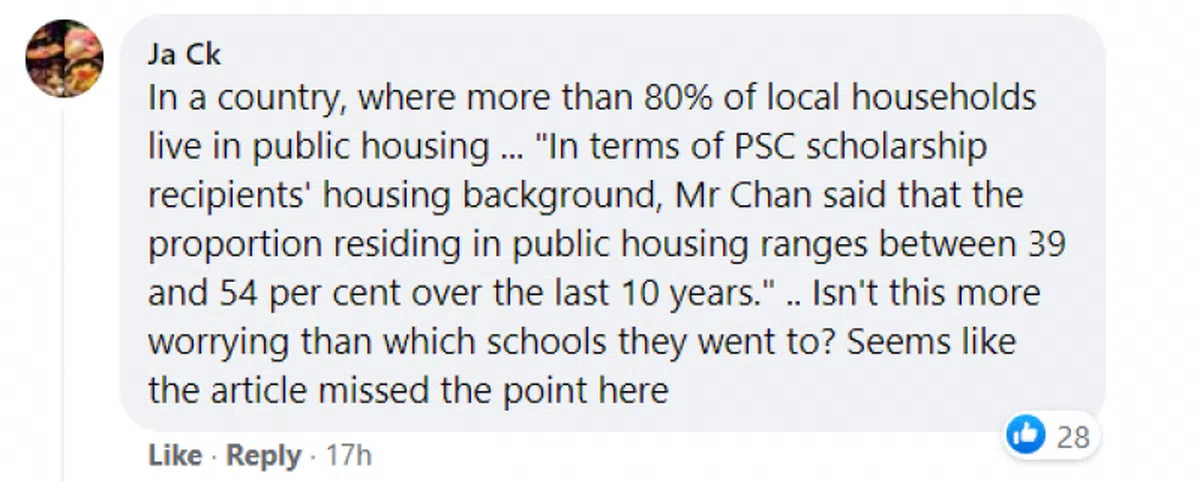 有网民也指出,新加坡80%以上的国人都住在组屋,但是公共服务奖学金得主中,只有39%至54%是住在组屋。奖学金得主在住屋背景上比例的差距,比起他们的学校背景更令人担忧。