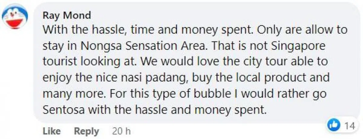也有网民表示,花了那么多时间和金钱,最后却只能在农萨度假村的范围活动,不是一般新加坡游客想要的。体验城市生活、吃Nasi Padang(印尼巴东饭)、逛街购物,才是去那边旅游的精髓。