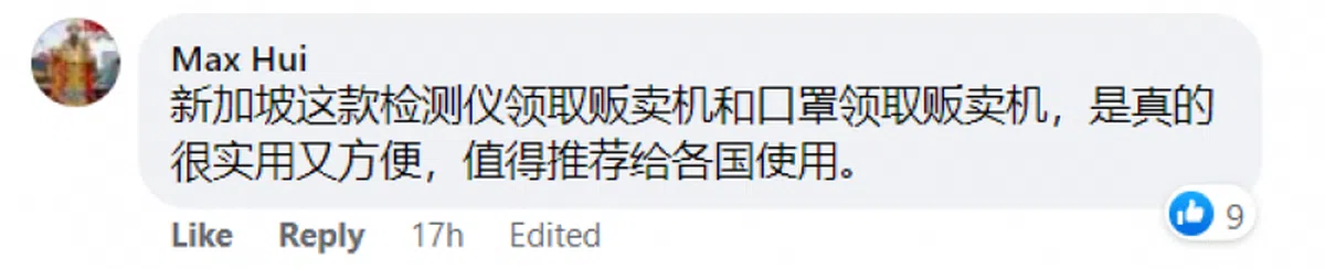 “一名在新加坡的朋友把这张照片发给我。自动贩卖机发放和出售ART检测仪,每包有五个。这就是一个政府有超前部署的结果。”