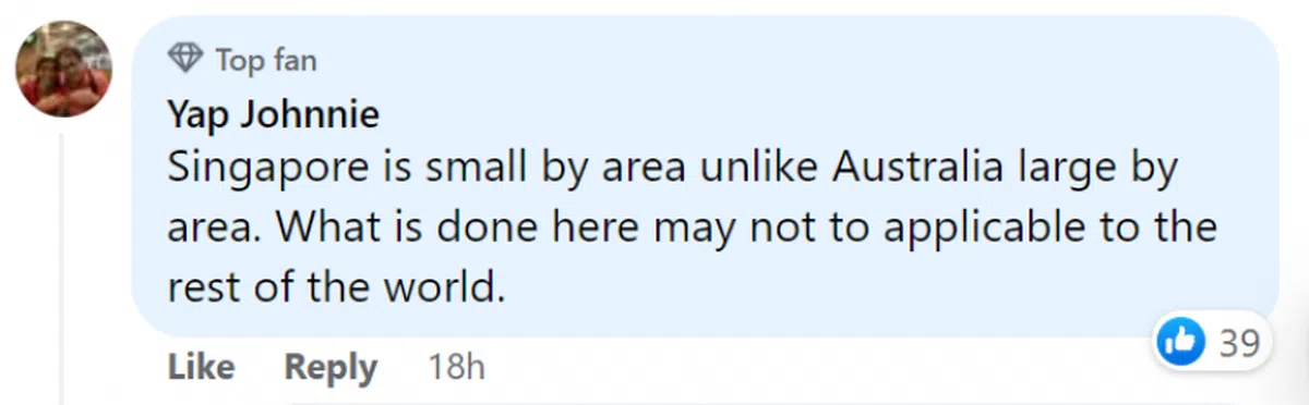 不过,也有网民指出,新澳两国并没有可比性。因为新加坡面积小,不像澳洲面积那样大,这里推出的措施可能不适用于世界其他地方。