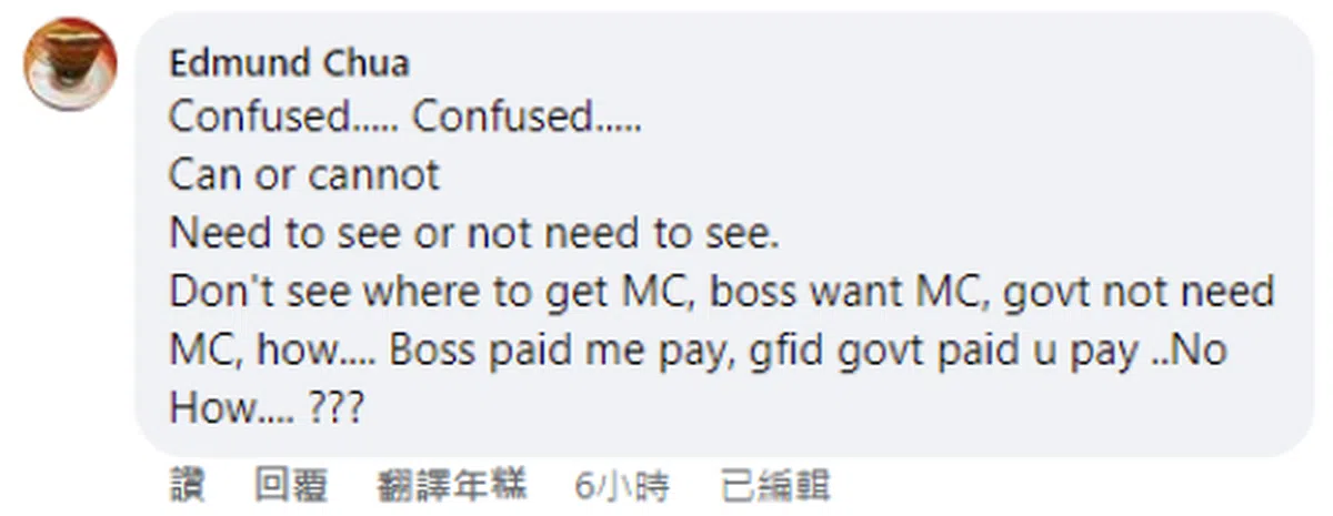 “很乱……很乱!到底可不可以,需不需要去看医生?不看的话哪会有病假单,老板说要病假单,政府说不用,所以是怎样?出粮给我的是老板耶!”