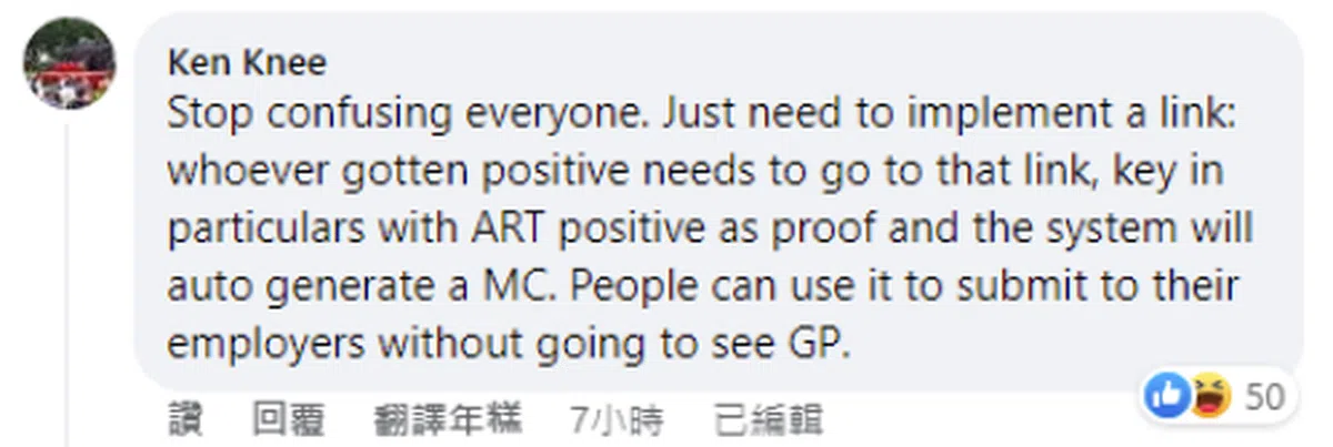 “你只需要提供一个链接,任何确诊的民众只须登录那个链接输入个人资料,然后提交自我快速检测呈阳性的相关证明,系统就会自动生成一纸病假单。如此一来民众就可以直接凭此向雇主请假,就不用去诊所了。”