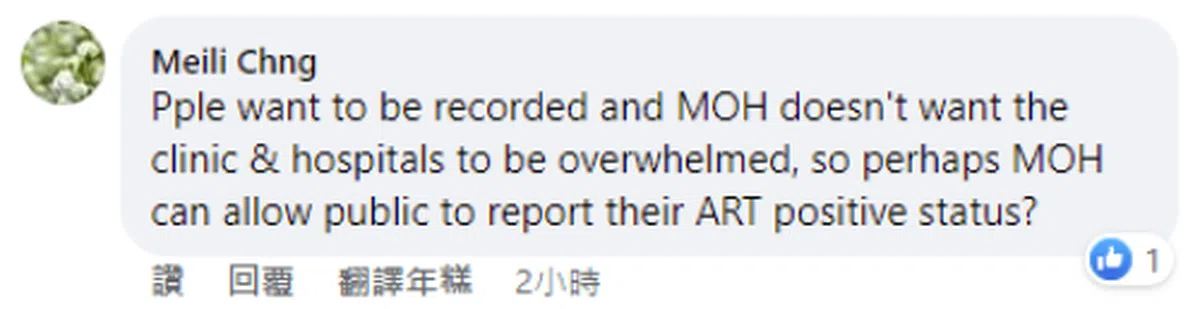 “大家想要自己的确诊纪录被记录在案,但卫生部又不希望诊所和医院爆满,所以或许卫生部应该允许公众有办法自行呈报ART自我检测的阳性结果?”