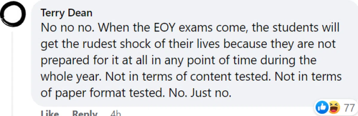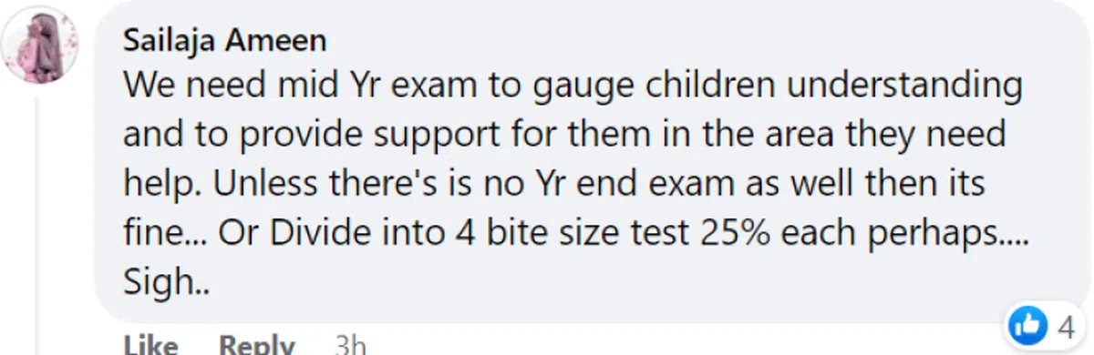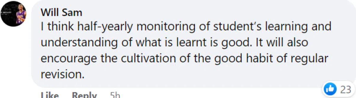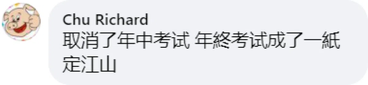 “取消年中考试但没有取消年终考试并不妥,因为这意味着将少了一个能够帮助学生了解弱项在哪里并为他们提供支援的环节。一个更好的做法是将年终考试分为一年四个小考,每场考试占比25%。”
