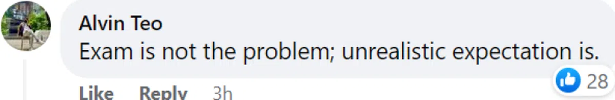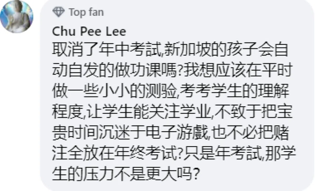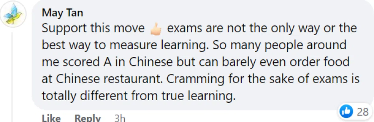 “我支持这么做。考试并非评估学习的唯一或者最佳方法。我身边有那么多人华文科考到A,但是一进到中餐馆却完全无法点餐。为了考试而死记硬背,跟真正意义上的学习完全是两码事。”