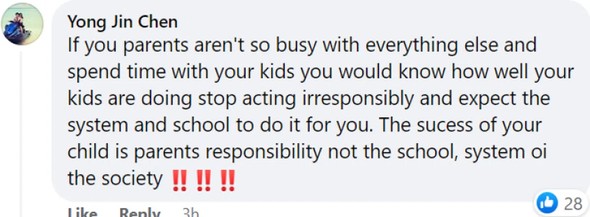 “你们这些家长啊,只要不老是忙于其他事物,花些时间与孩子在一起,肯定会清楚孩子们的进度。所以请不要再摆出这种不负责任的态度,总是希望学校和体制能帮你办妥一切。你的孩子成功与否,是家长的责任,不是学校、不是教育体制,更不是社会的责任。”