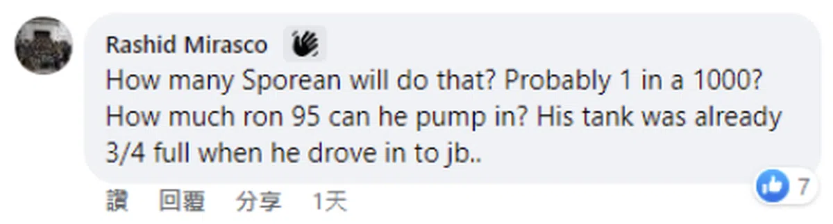 “有多少新加坡人会这样做呢?一千人中可能只有一个?他能添多少RON95汽油?他开车到新山时,油缸就已经四分之三满了。”