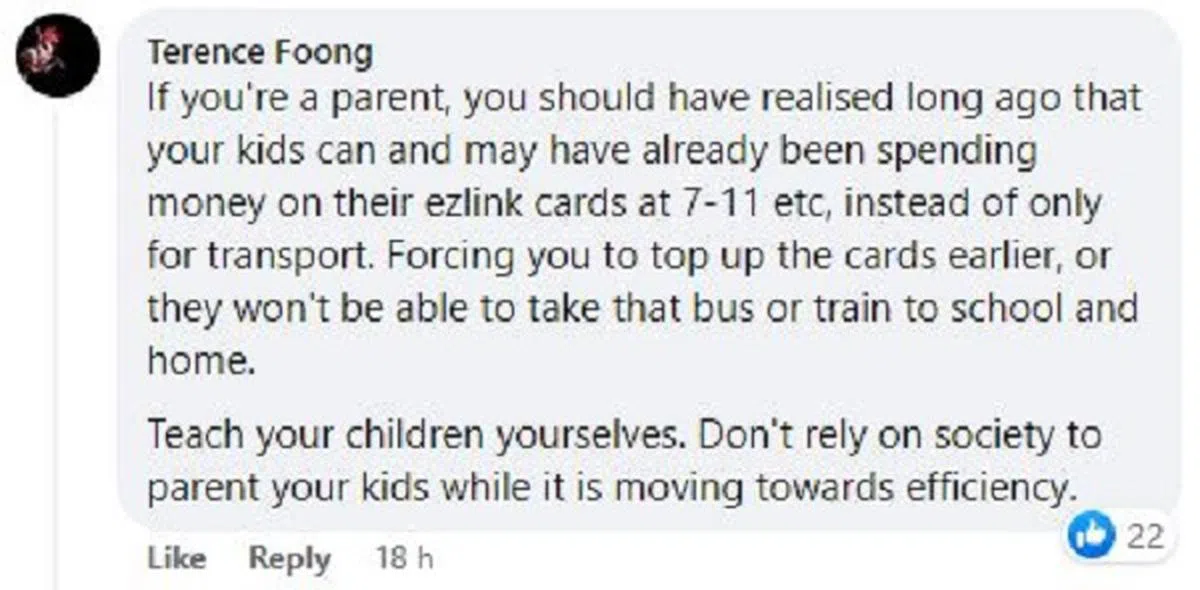 有网民进一步指出,身为家长应早就意识到,孩子不仅仅使用易通卡通勤,也在用它来支付其他消费。因此孩子卡上经常不够钱,促使家长必须及早帮他们充值易通卡,否则他们就无法搭巴士或地铁到学校或回家。
