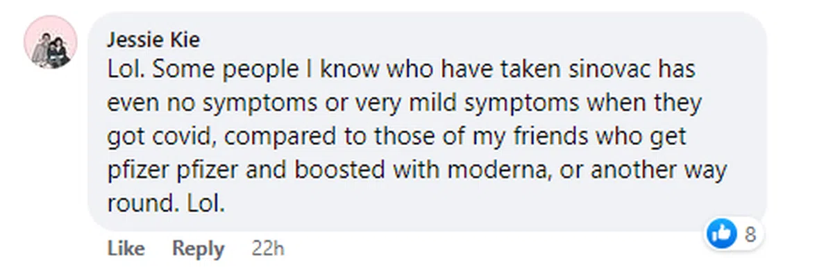 值得注意的是,表示接种科兴或国药疫苗后没出现症状或仅有轻微症状的网民,都如以下网民,已接种了三剂科兴疫苗: