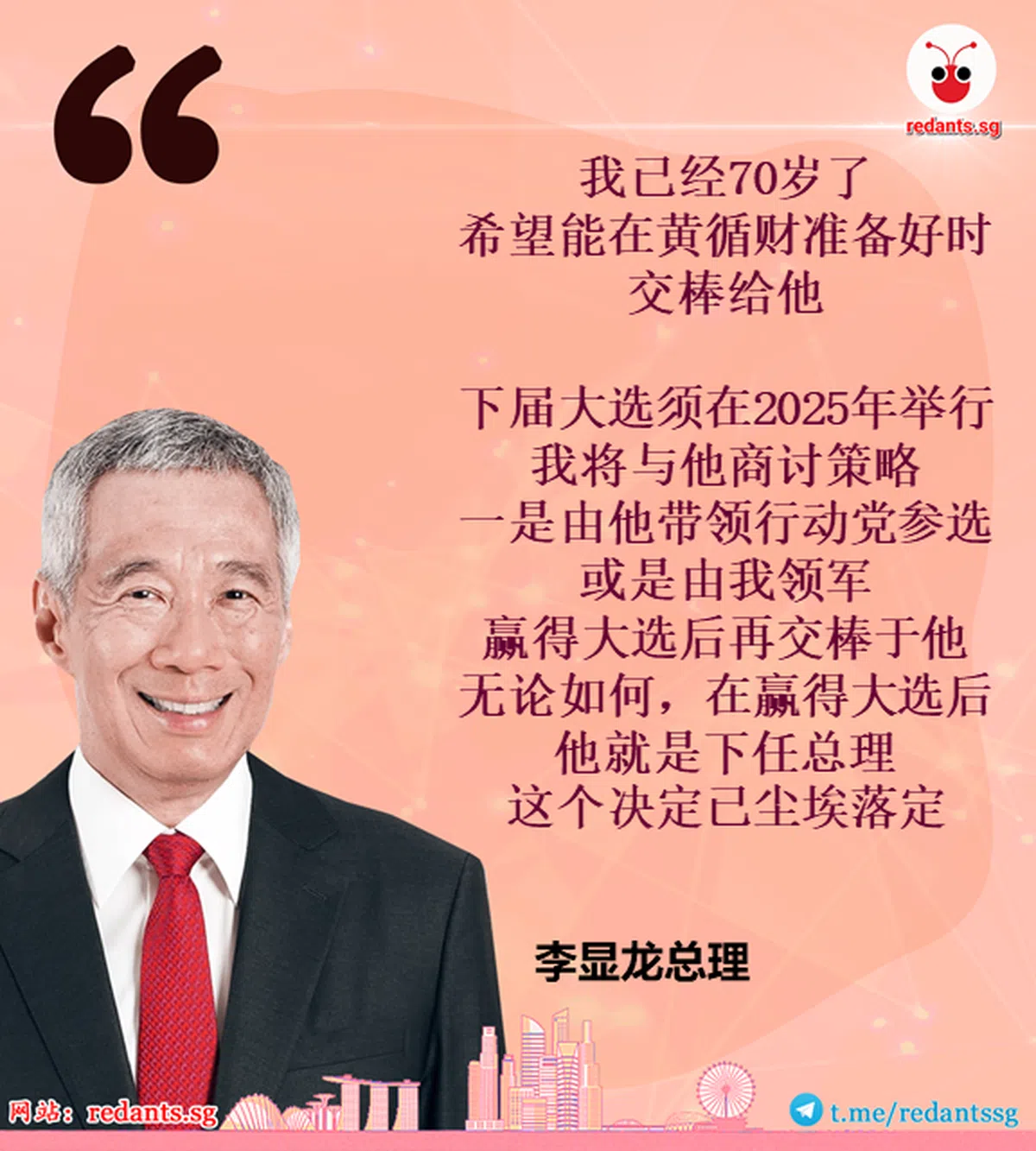 “建国以来,新加坡的政治领导强调的是团队而不是个人。在过去两年里,第四代领导们一起对抗疫情,建立起了非常好的默契和更强的凝聚力。……在我们面前的挑战还很多,但我相信只要政府和人民团结一心,一定可以披荆斩棘,为新加坡打造更美好的未来。”