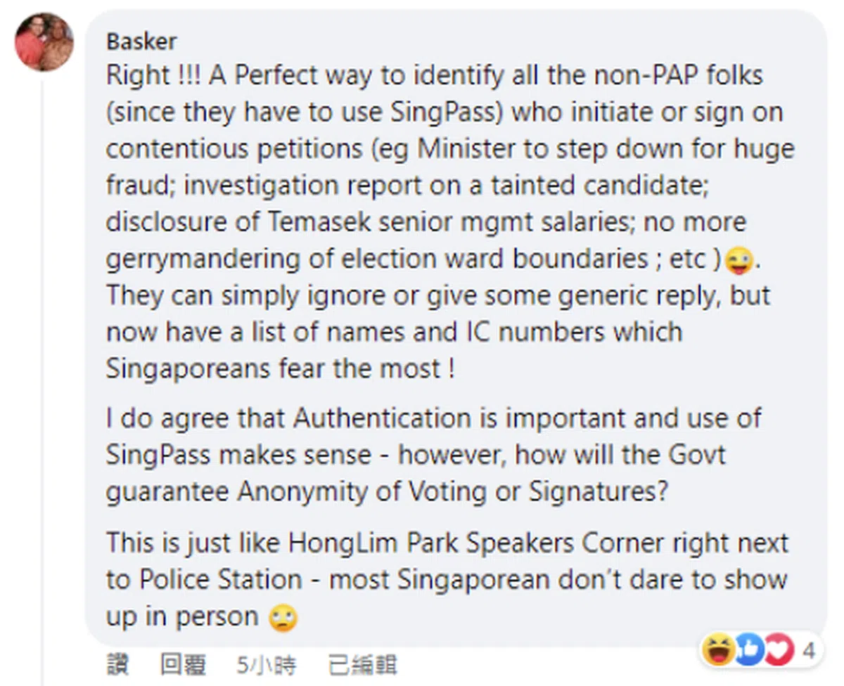 这篇报道刊登后,网民对“PetitionsSG”须用SingPass登入,但又号称可以同时做到匿名,且不记录联署人资料的说法存有疑问。
