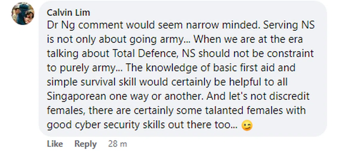 另一名网友也说,撇开军训不谈,学习基本急救和野外求生技能对所有新加坡人都有用处。况且,一些女性在网络安全方面也显露了才华,因此不该将全民防卫局限在军事防卫上: