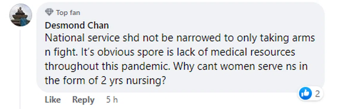 这名网民说,冠病疫情凸显了新加坡在医疗资源方面的短缺,而女性能在两年的国民服役期间当起护士,做出贡献: