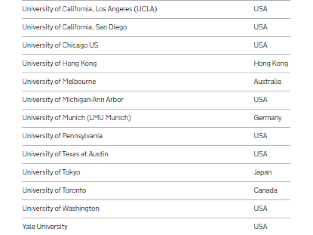 这些大学必须在美国US News、英国的QS教育集团、以及泰晤士高等教育的世界大学排名榜上有名,而且必须至少在两个榜单里排名前50。