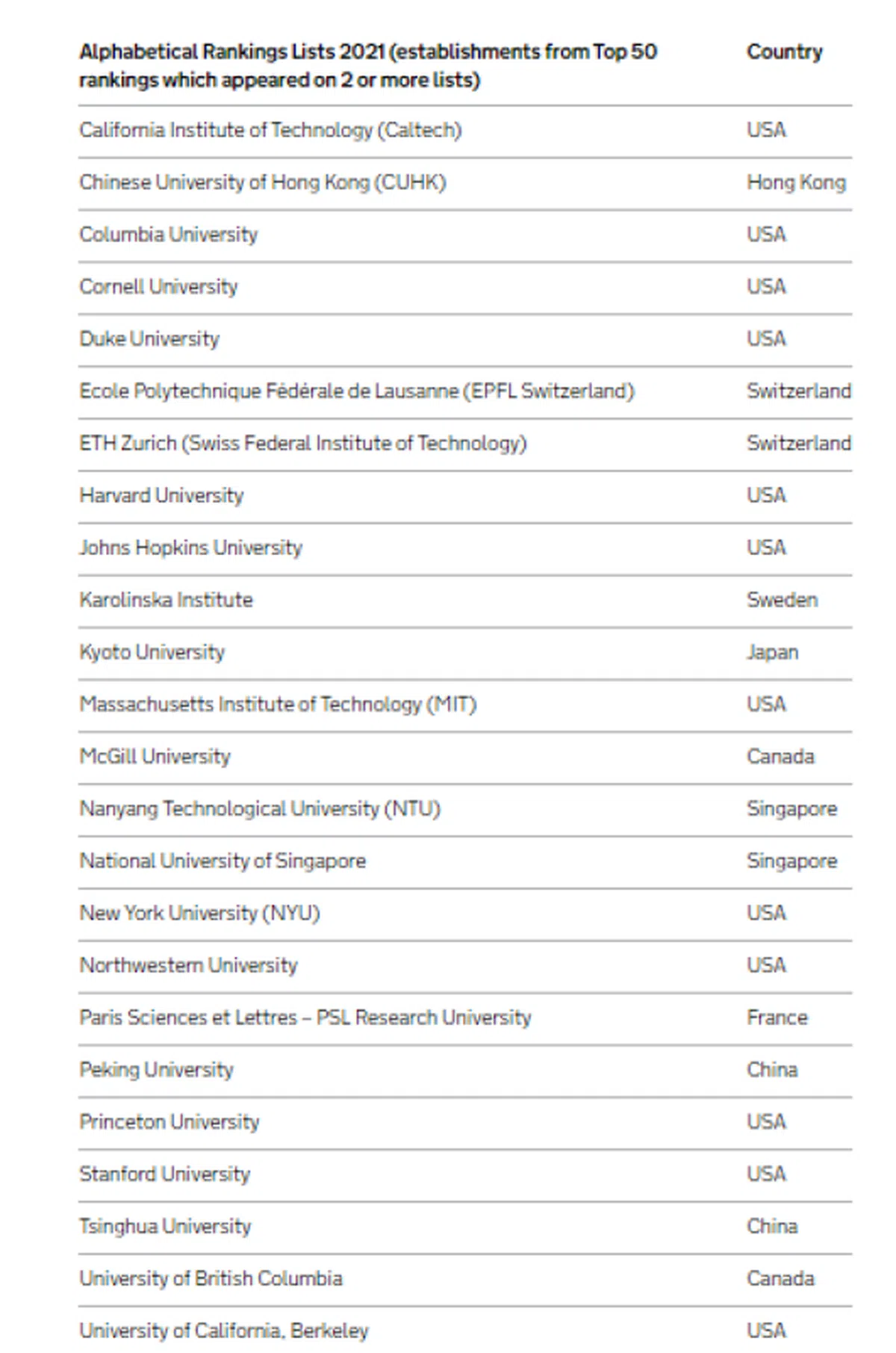 英国当局也列出了过去五年(2016年至2021年)属于世界顶尖大学的榜单,每年大约有40间大学上榜。