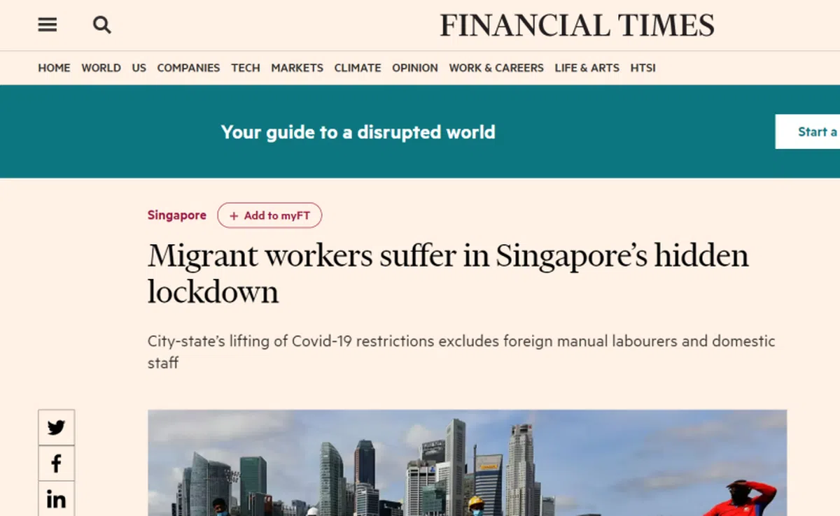 英国媒体《金融时报》在新加坡时间6月6日刊登了一篇题为“客工在新加坡隐形封锁下受苦”,副标为“这个城市国家在解除冠病防疫措施时,将外籍客工和外籍女佣排除在外”。