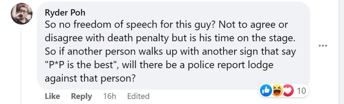 有网民指出,撇开对死刑的看法,这是卢克在台上的个人时间,他难道不应该有属于他自己的言论自由?如果有另一个人上台时拿着另一个牌子,写着“某某党是最好的”,会有人报警举报他吗?