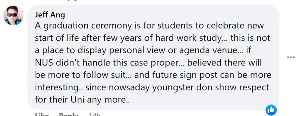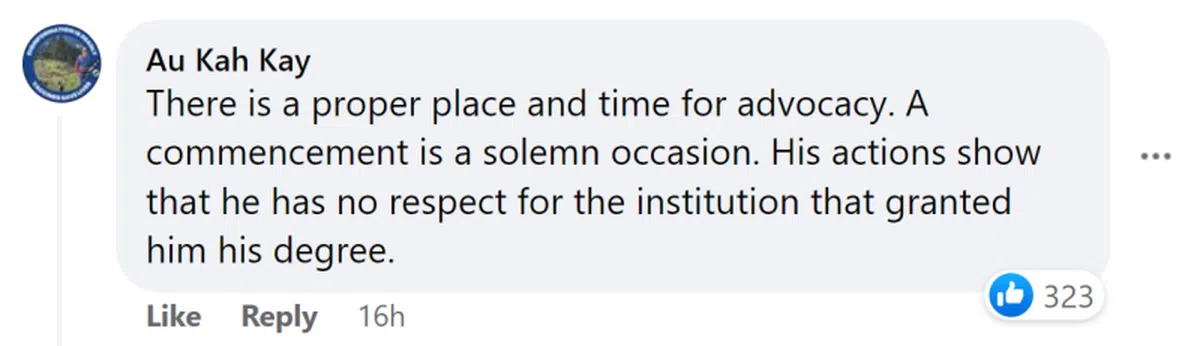 一位网民就说,有其他更为妥当的地点和时间去倡议自己的观点,毕业典礼是一个庄严的场合,他的行为表明他不尊重授予他学位的大学,不尊重其他毕业生和来宾。