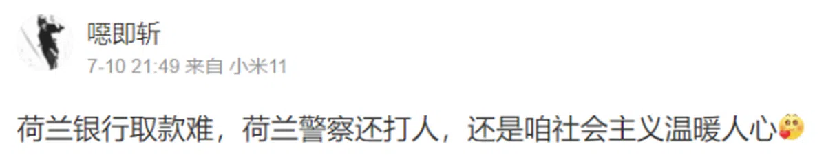 “荷兰银行取款难,荷兰警察还打人,还是咱社会主义温暖人心。”