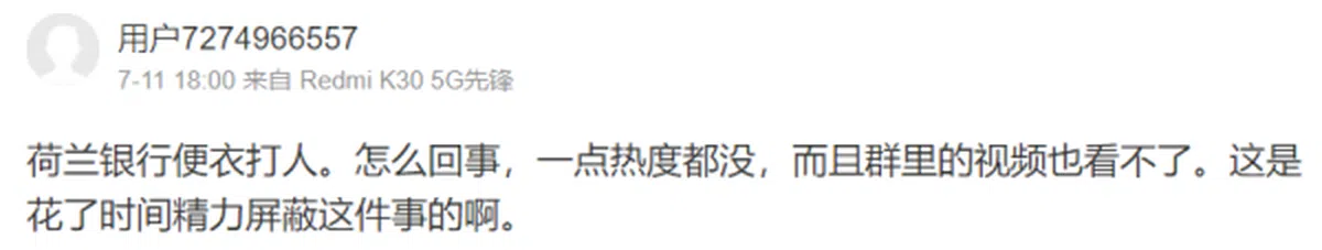 “荷兰银行便衣打人。怎么回事,一点热度都没,而且群里的视频也看不了。这是花了时间精力屏蔽这件事的啊!”
