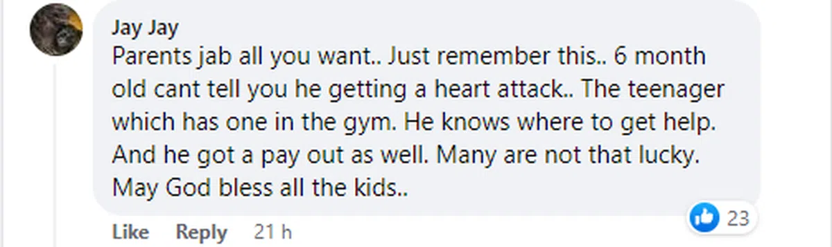“家长们你们要打(疫苗)就打吧... 但是记得,6个月大的婴儿是不懂得怎么告诉你他心脏病发作的。(去年7月)在健身房里心脏病发作的那名青少年知道如何求助,也获得赔偿,但许多人没那么幸运。”