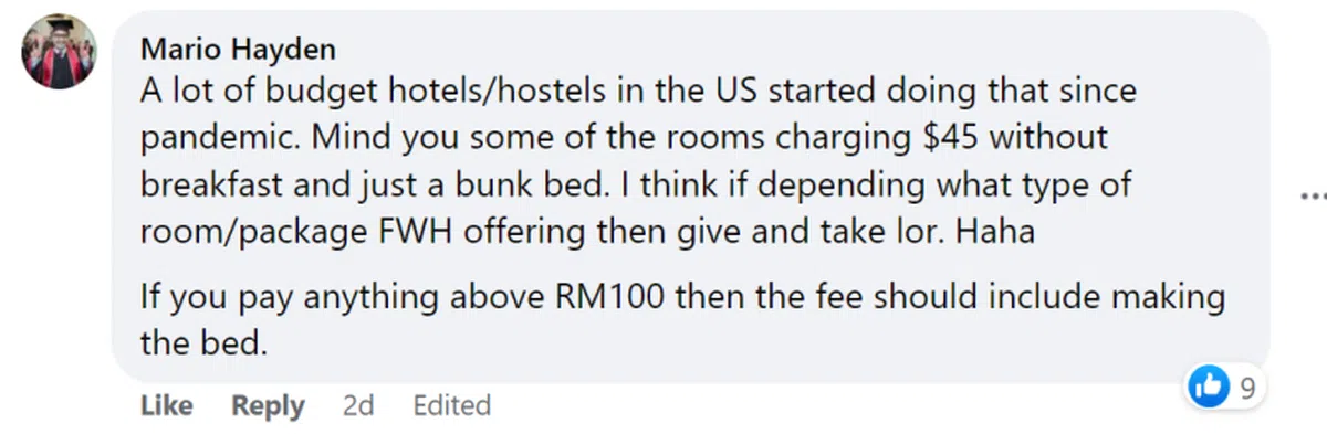 有网民也指出,其实自冠病大流行以来,美国的许多廉价酒店和旅馆已开始推出这类自行铺床的概念。不过他认为,如果房价原本就不便宜(马币100元以上),那就应该包含铺床的服务。