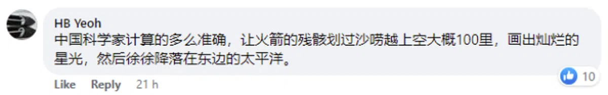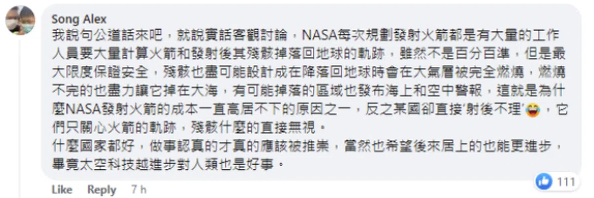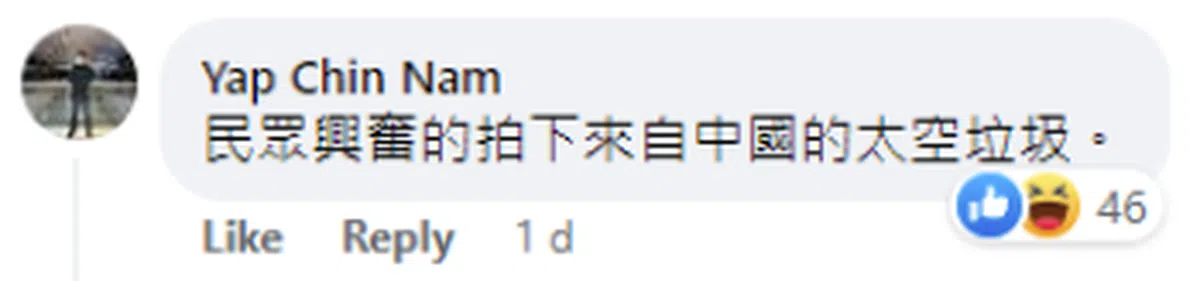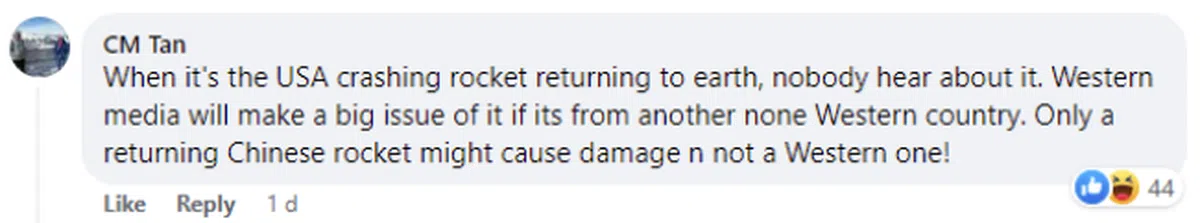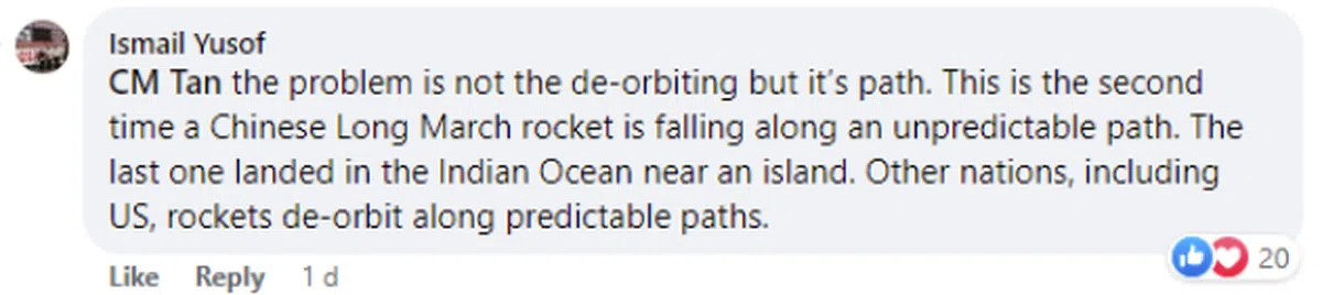 “天外飞仙”的真相随之引发热烈讨论。不少马国网民质疑,中国没有提前分享有关潜在危险物体坠落的信息,是不负责任的行为。
