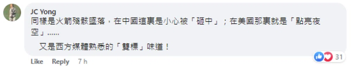 不过,也有网民反驳上述观点,强调中国之所以受到抨击,是因为其火箭碎片的坠落路径是“不可预知的”。