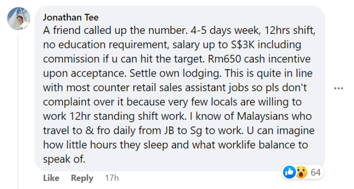 还有人自称有朋友已经亲自询问该招聘中介了。对方告知,一周工作4至5天,每天工作12小时,要达到销售目标,加上了提成,才会有高达3000新币的工资。