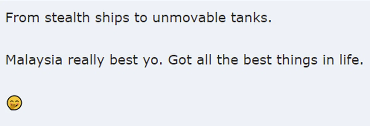 “前有看不见的船,后有动不了的坦克。马来西亚真的很棒哟,所有生命中最棒的事物我们都有份。”